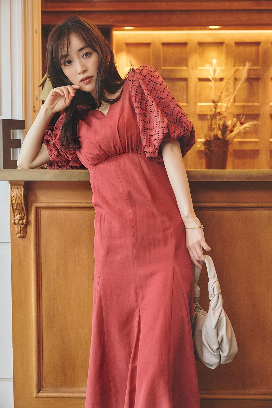 ボリューミーな袖とコーラルオレンジが映えるワンピース。ハイウエスト切り替えから裾に向かって広がるマーメイドラインに、袖には幾何調の穴あき刺繍を施した秋のムードを誘う1着。