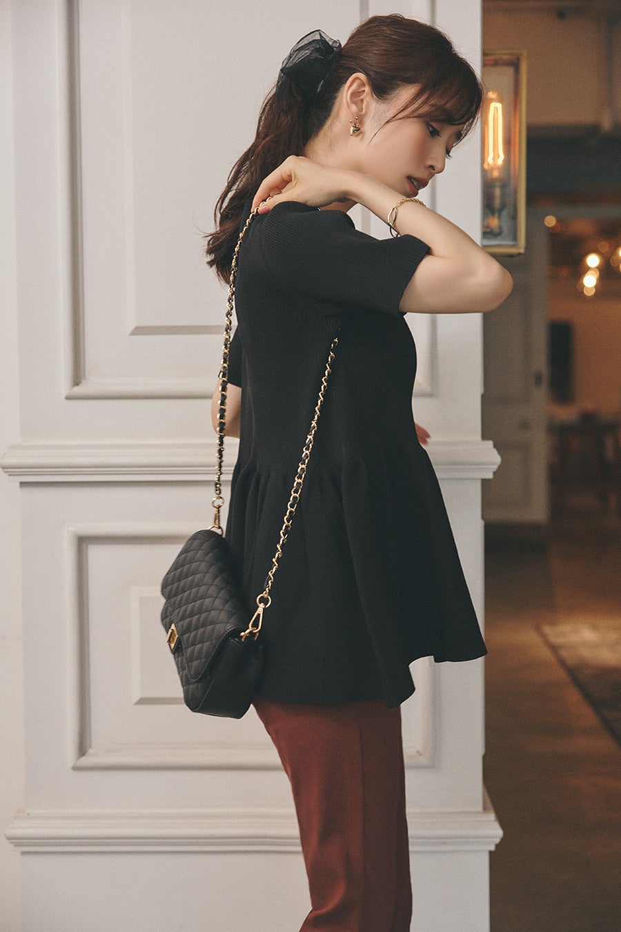 ウエストからふわっと広がるペプラムシルエットのニットに、シュッと裾に向けて細くなるテーパードパンツ。黄金バランスの組み合わせはダークカラーで大人っぽく更新して。