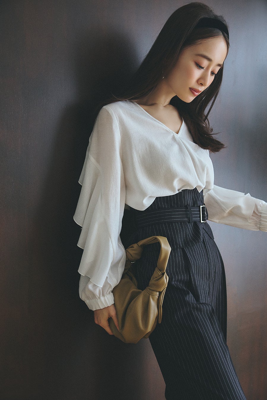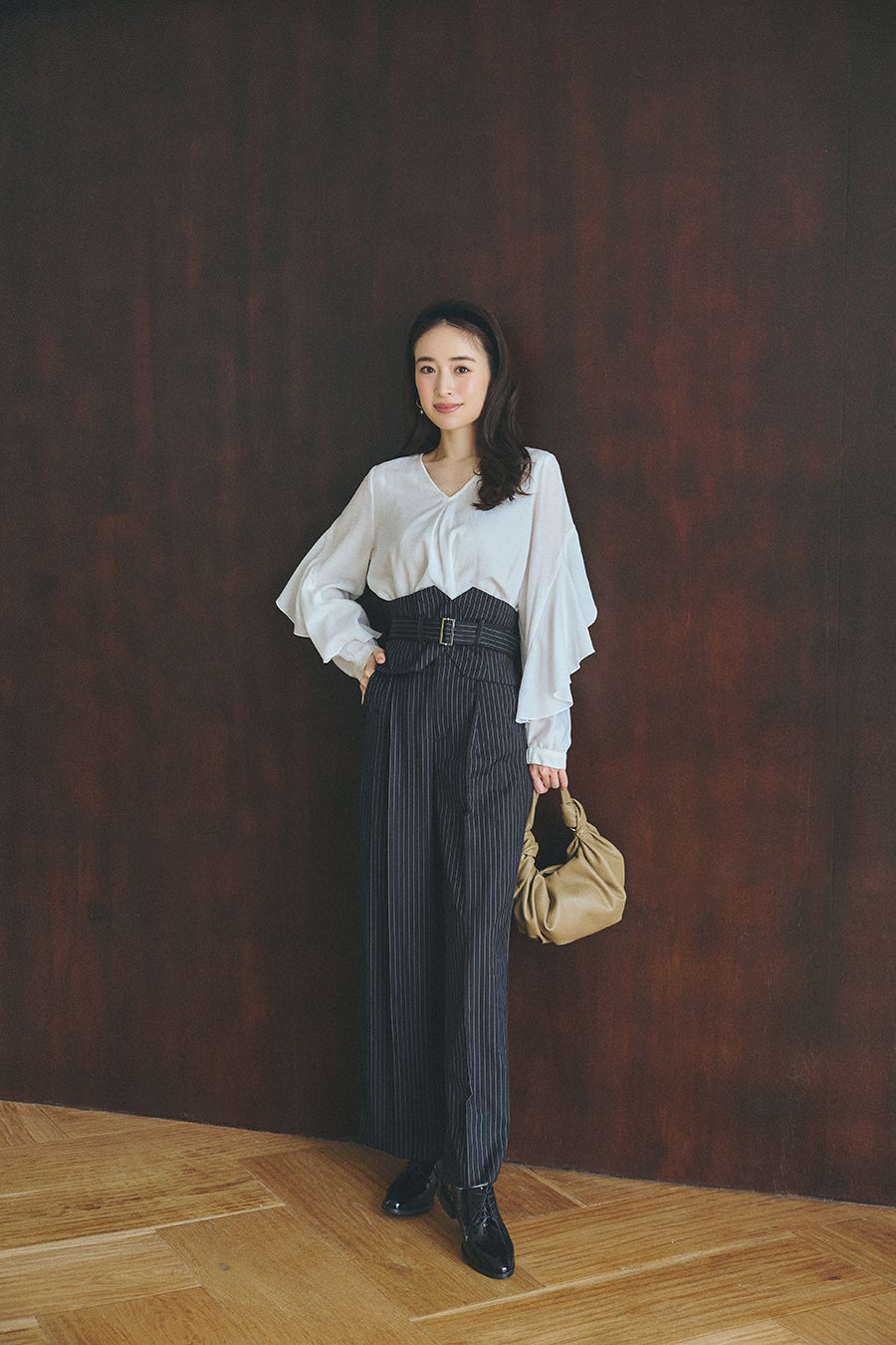 装飾的なフリルデザインのブラウスは、マニッシュなアイテムと合わせて今っぽいバランスに昇華。ハンサムな印象のピンストライプパンツはコルセット付き。ウエストコンシャスなデザインに上品な色香が漂います。