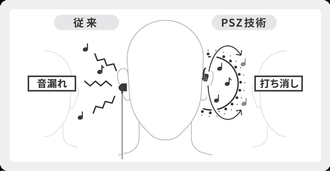 PSZ技術は、NTTのコンピュータ&データサイエンス研究所で開発され、耳をふさがずに、耳元だけに音を閉じ込めます。「ある音波に、180度反転させた波形(逆位相)を重ねると干渉し合って音が消える」原理を応用しています。nwmの耳スピーカー「耳スピ」では、音を打ち消すために逆位相を活用する斬新な発想とともに、度重なるシミュレーションとハードウェア改良によってバランスの良い音質を実現。耳元付近の360°に音を閉じ込め、音漏れを最小限に抑えています。