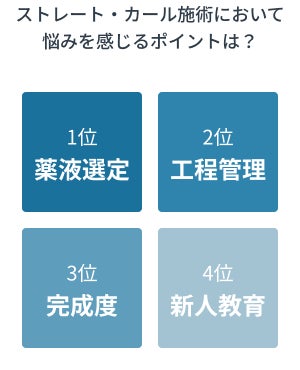 加えて、思い通りの仕上がりにならない不安や薬液選定への迷い、新人教育の負担、ダメージリスクを懸念して提案を控えるといった現場の課題も浮き彫りになっています。