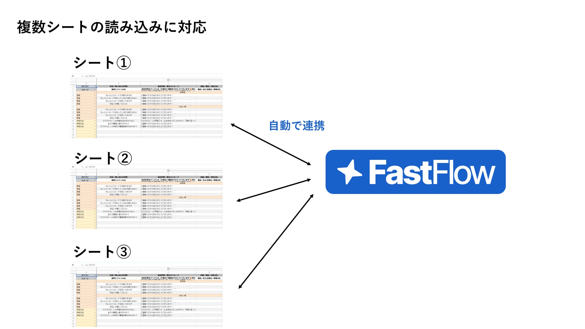 多くの企業では、製品やサービスカテゴリ、問い合わせ種別ごとにFAQ情報をシートで分けて管理しています。従来のFastFlowでは、参照するテンプレートをファイル単位で指定する必要がありましたが、今回のアップデートにより、1つのスプレッドシートファイル内の複数シートを一括で読み込み、テンプレートとして活用できるようになりました。