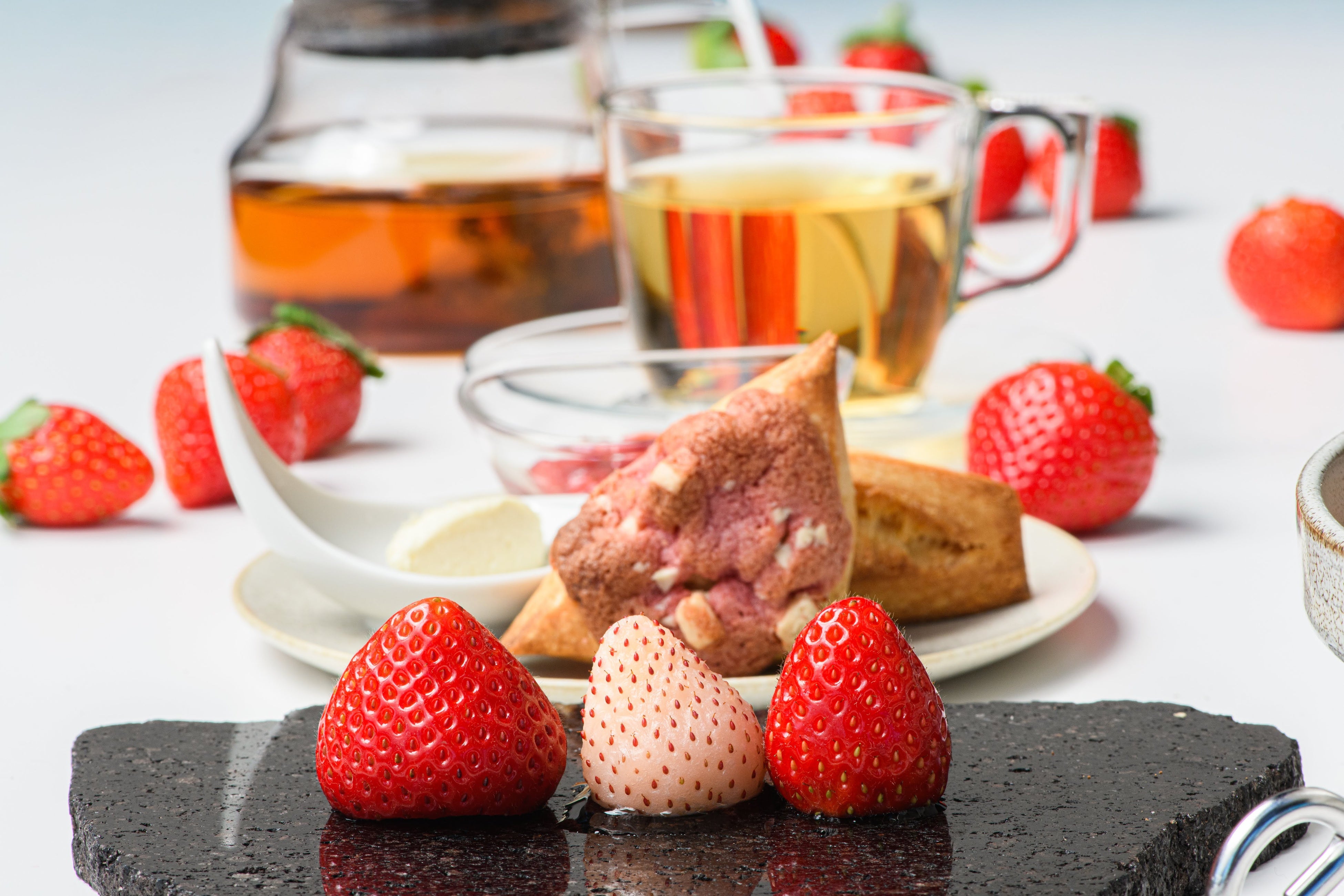 上段には、苺クリームのロールケーキや苺とレアチーズタルトなど、甘酸っぱい苺とクリーミーなチーズやホワイトチョコのハーモニーが楽しめるスイーツが勢ぞろい。苺とノンアルコール白ワインのジュレは、透明感のある美しさでテーブルを彩ります。下段には、フランス料理のコンクールで日本一に選ばれたシェフが手掛ける繊細なセイボリーをラインナップ。さらに、苺ジャムとクロテッドクリームを添えたスコーンは、プレーンと苺&ホワイトチョコの2種類をご用意。バターのきいた密度の高い食感と苺の甘酸っぱさが絶妙なバランスです。さらに、期間限定の香り高い紅茶を含むフリーフロードリンクで、心ゆくまでティータイムを楽しめます。