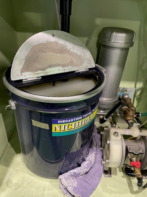 ダイカストには「離型剤」という薬剤が欠かせません。製造した成形品と金型が密着しすぎるのを防ぎ、成形品を金型から取り出す際に生じる摩擦を減少させ、破損を防ぐ役割があります。離型剤の原液には油分が多く含まれており、水で希釈して使用します。この油と水の混ざった希釈液はやがて腐敗し、特に夏は強いニオイを発生させるため現場の大きなストレスとなっています。
