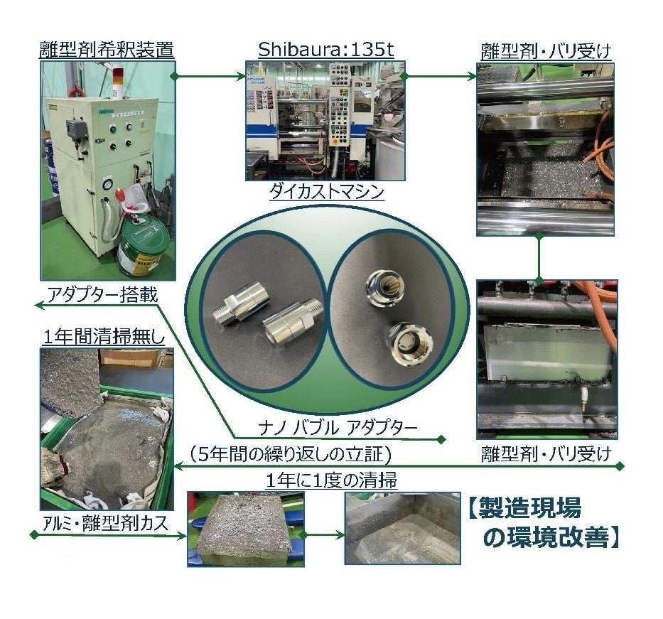 【共同開発】ダイカスト業界初!離型剤希釈装置に極小泡を活用! アダプターでニオイ消え清掃が年1回に減少、5年間の実証稼働で効果あり