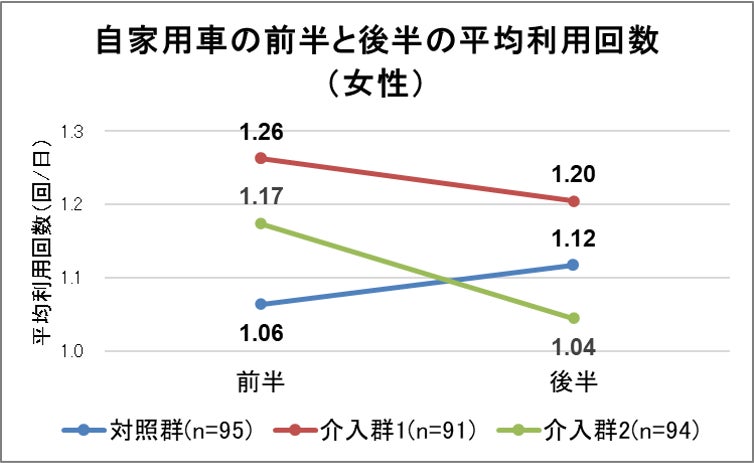 被験者全体での有意性は確認できなかったが、女性に限ると、対照群に比べて介入群2(目標設定と金銭インセンティブ)では自家用車の利用回数の減少幅が有意に大きかった(p値=0.005)。