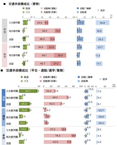 移動目的別(同調査)では、通勤では自動車利用割合が地方都市圏に比して小さい三大都市圏でも休日の買い物では、その差が縮まり53.8%が車を利用している。公共交通へのアクセスが良くても遊興目的でマイカーを利用している可能性がある。