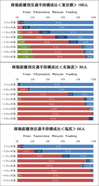 1.0km未満の距離の移動では、東京都が25.5%であるのに対し、北海道では65.0%、塩尻市では58.9%と約2.5倍である。
