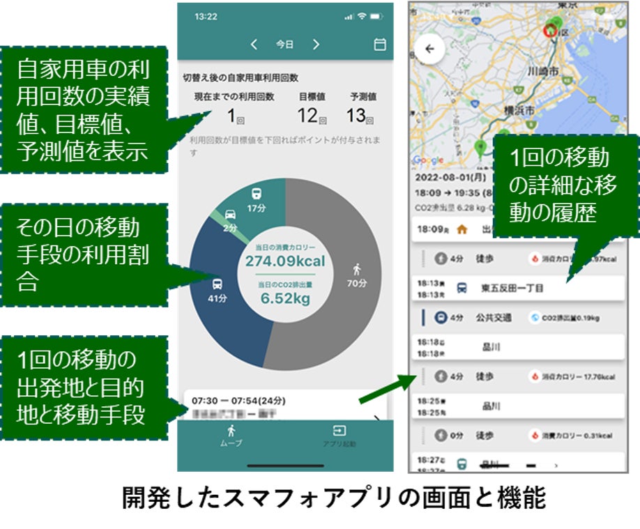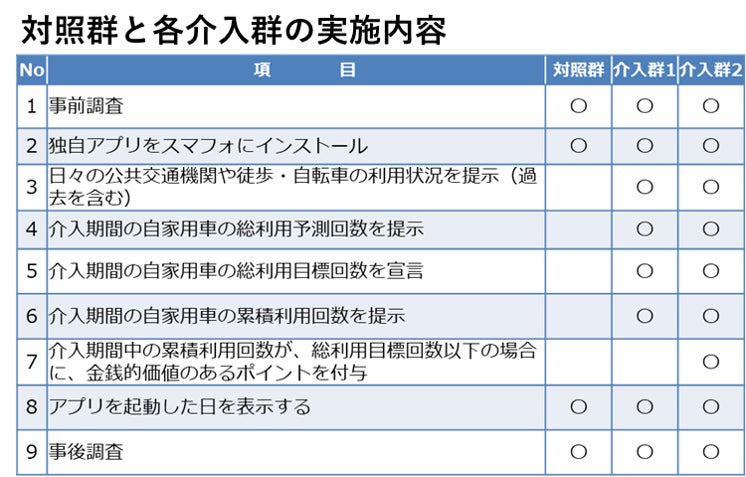全国モニター1,200人を対象に、各人の自家用車利用回数をAI予測し、スマフォに提示するシステムを開発し、徒歩・自転車や公共交通機関の活用などで自家用車の利用を手控えた回数に対し、金銭ポイントを付与する8週間のランダム化比較試験(後述)