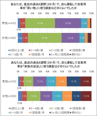 女性は男性に比べて買い物と家族の送迎目的での自家用車の利用頻度が有意に多かった。(p値=0.006~0.012)