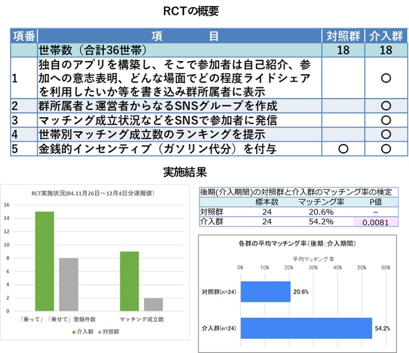 住民との対話を通じ、マッチングアプリを開発し、実験を行ったところコミットメント・ランキング等の介入施策を講じた群の「乗ってください」「乗せてください」マッチング成立件数が有意に多かった。