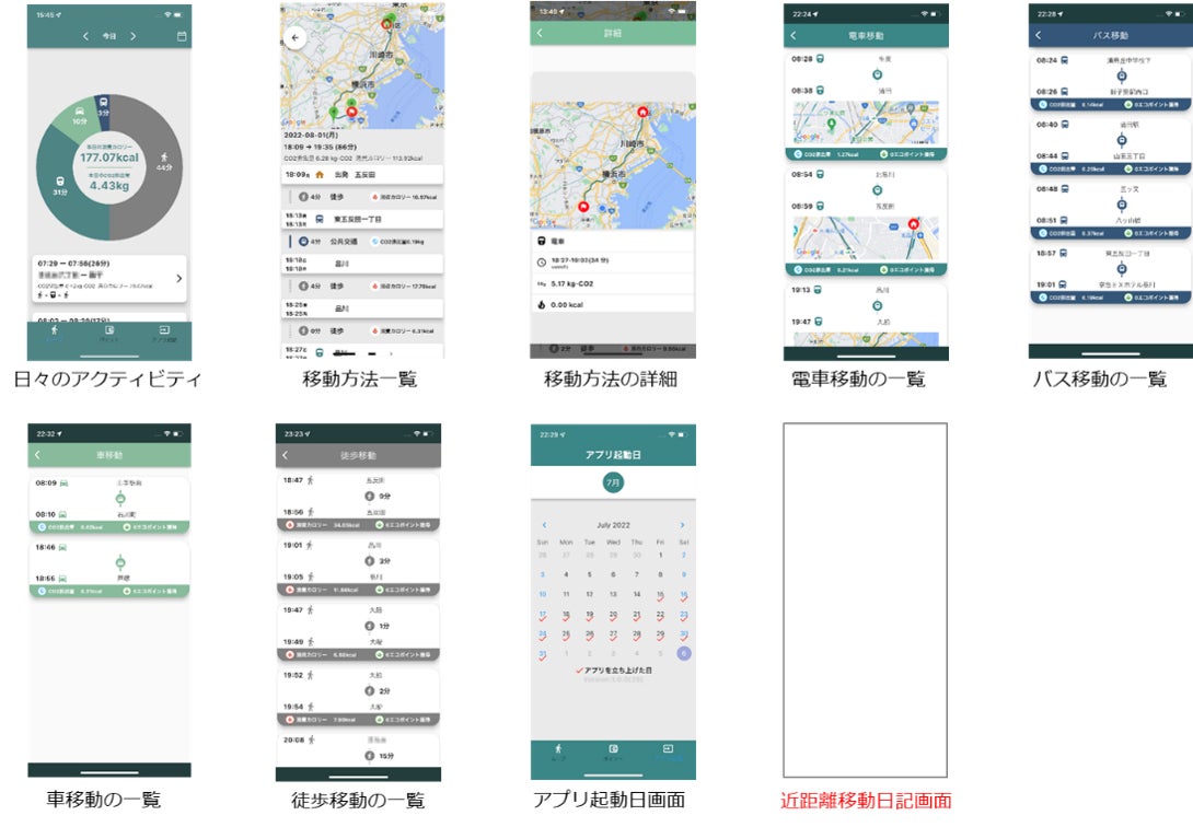全てのモニターに、独自開発したスマフォアプリをインストールいただき、日々の移動履歴(発着日時、発着場所、移動手段など)を自動収集した。