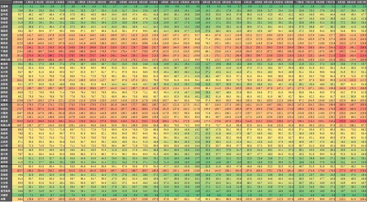 下図は、各都道府県を出発点として居住人口あたりの県境を跨いだ人流の、2019~20年の10か月間の週次推移である。緊急事態発令後に広域人流は激減した後、元の水準に戻らなかったことを示している。