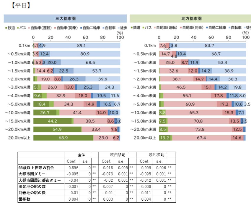 地方部は都市部よりもマイカー利用割合が高く、また、公共交通インフラへのアクセス状況に影響されることが示された。