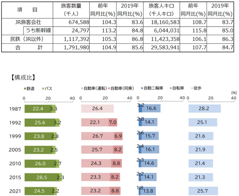 国交省調査(下図)は、COVID-19禍後、鉄道・バス利用が自動車(同乗)と徒歩に代替されていることを示している。