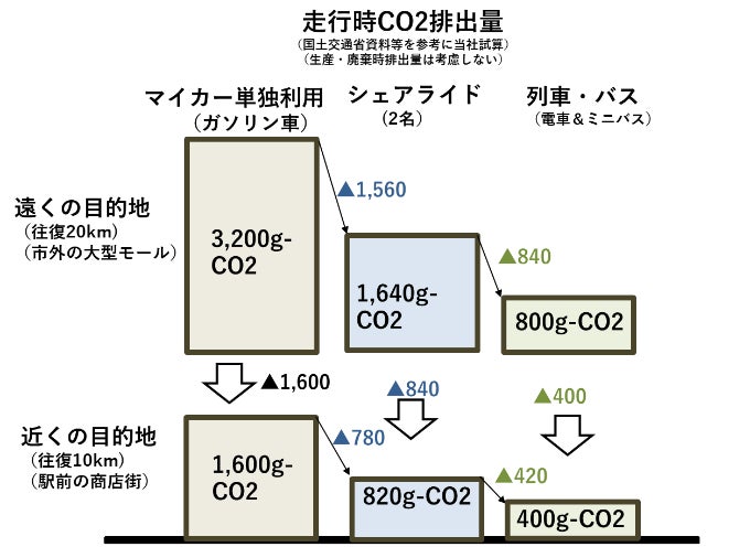 マイカー単独利用よりも、2人でシェアライドすれば単純計算では半分で済みますし、列車・バスを利用すればさらに減ります。また、同じ移動手段でも、遠くの目的地に行くよりも、近場で済ませれば、それだけ排出量が減ります。
