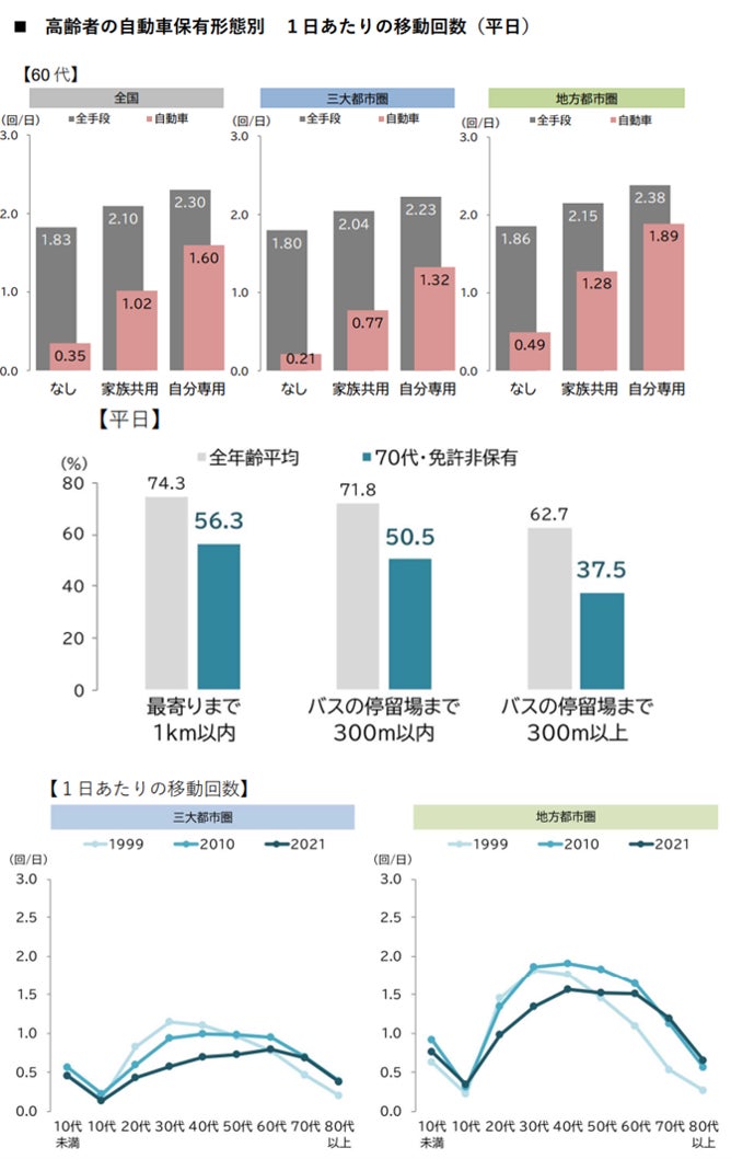70歳台免許非保有者と全年齢との平日の移動率の差は、鉄道駅・バス停と自宅との距離が離れているほど拡大している(同調査)。免許非保有者は駅・バス停が遠いほど家にこもりがちになる。