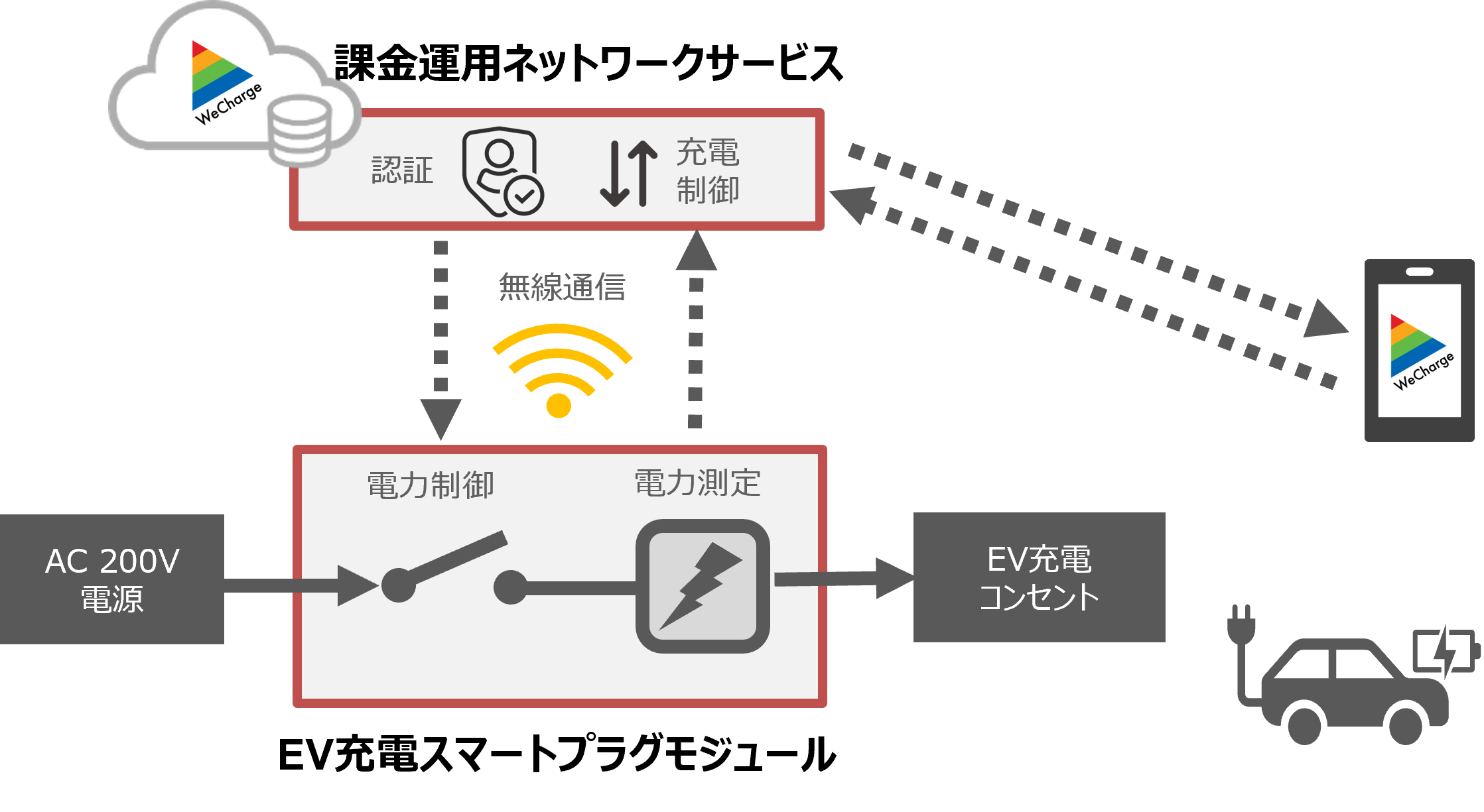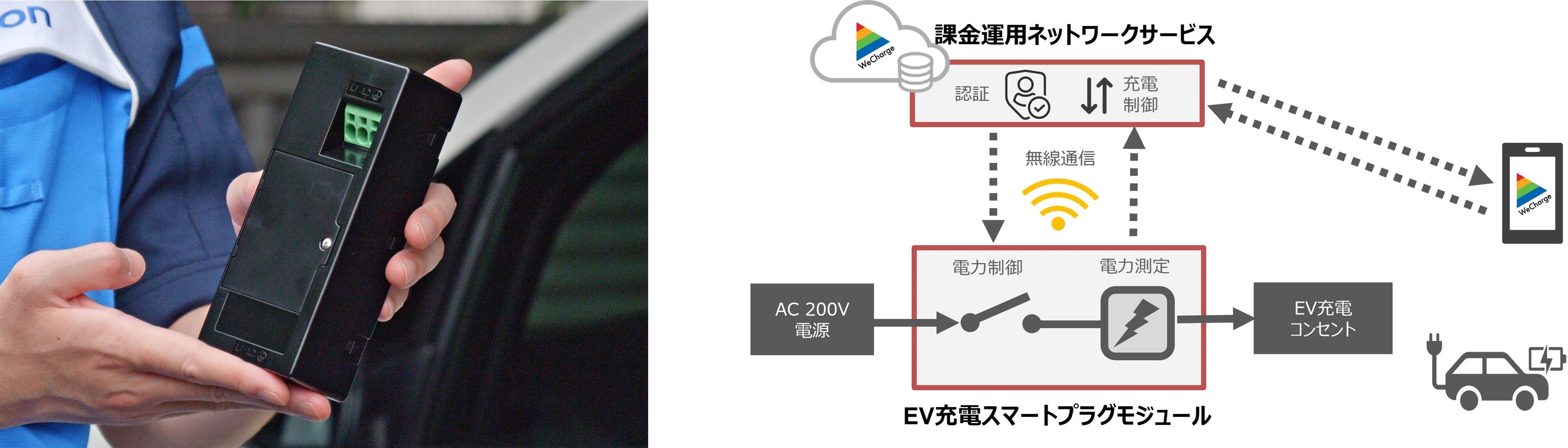 ユビ電社との”共創”により製品化。本モジュールにより利用者毎の電力量を測定し、無線通信でユビ電社クラウドと接続します。これによりEV充電課金サービス「WeCharge」の導入をEV充電用コンセント1基から手軽に実現でき、EVインフラ普及に貢献します。