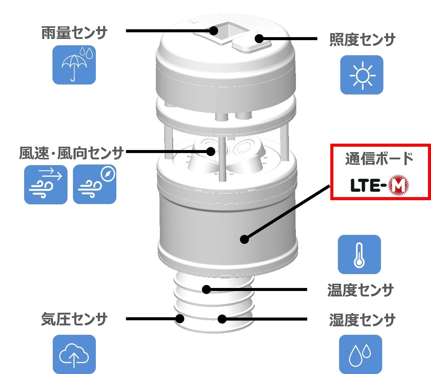 気温、湿度、気圧、降水量、風向、風速、照度の7要素を毎分観測でき、無線通信機能も備えた小型で高性能な気象IoTセンサーです。