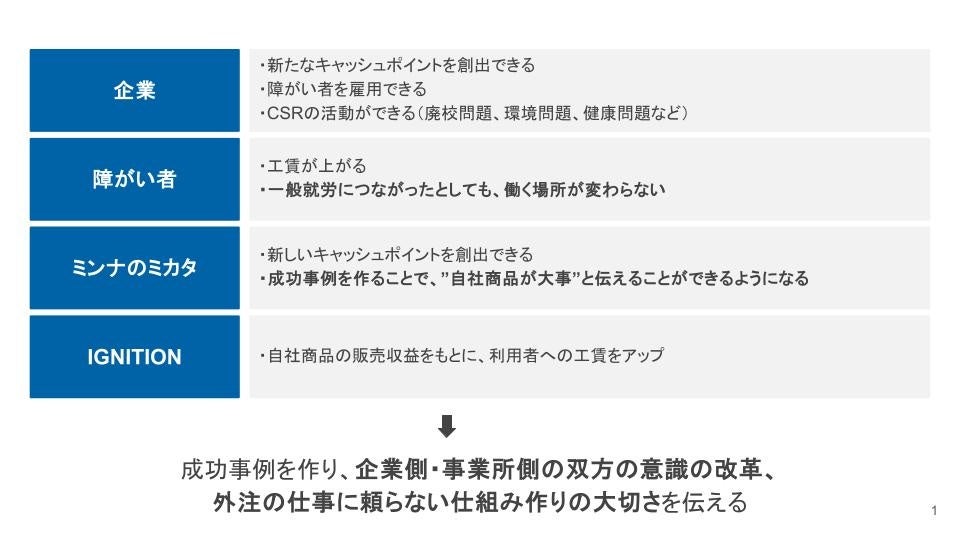 株式会社IGNITION(本社:千葉県袖ケ浦市、代表取締役CEO:佐藤 吏、以下 IGNITION)と、株式会社ミンナのミカタホールディングス(本社:栃木県鹿沼市、代表取締役:兼子 紘子、以下 ミンナのミカタHD)は、この度、障がい者就労支援分野における新たな価値創造と社会問題解決に向けたパートナーシップを締結いたしましたことをお知らせいたします。
