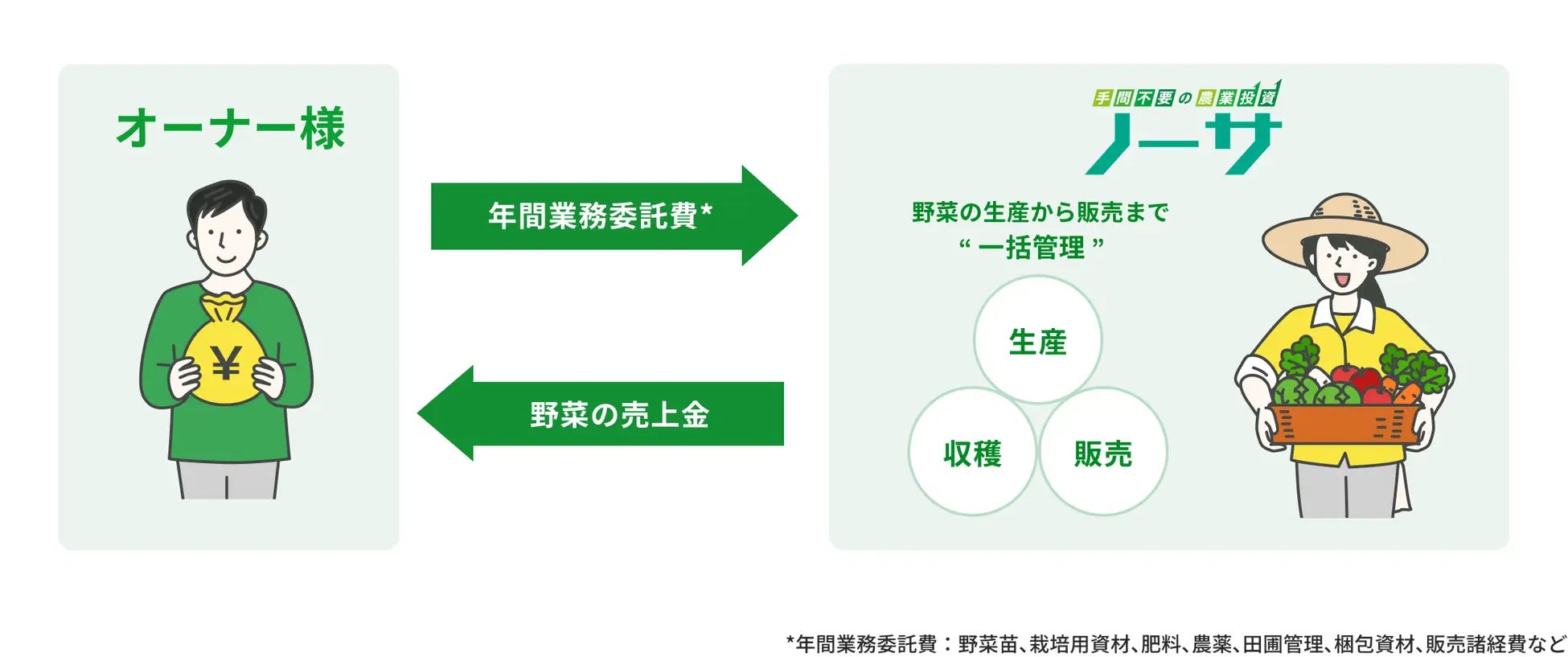 年間業務委託費をお支払いいただくことで、農業のプロであるクールコネクト社が、オーナー様に代わって品質の高い野菜の生産から販売まで一貫して実施。収穫した野菜の売上高がオーナー様に支払われる仕組みです。新規の野菜オーナー様も、引き続き募集中です。