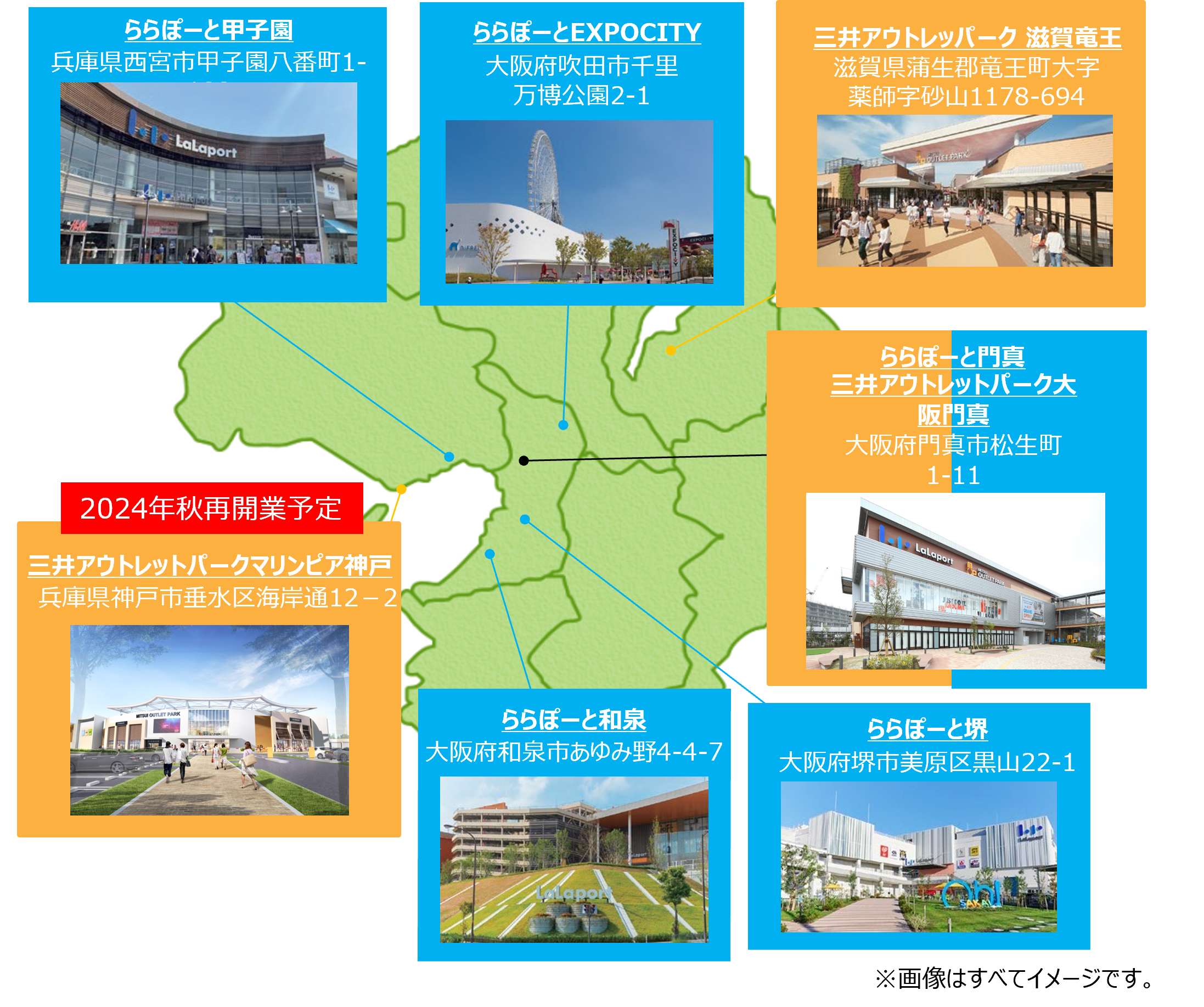 の三井ショッピングパーク ららぽーと(甲子園・和泉・堺・EXPOCITY・門真)、三井アウトレットパーク(大阪門真・