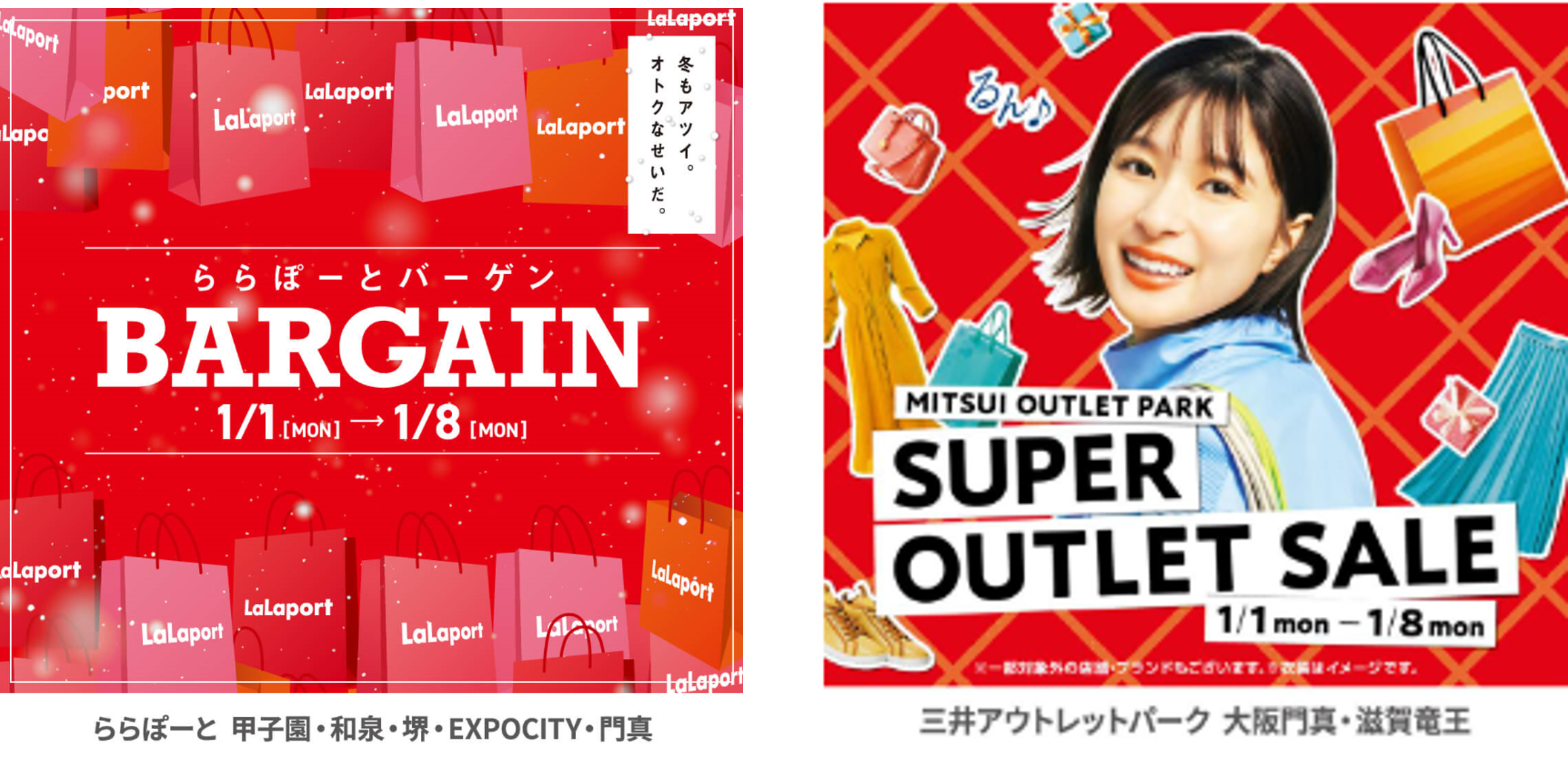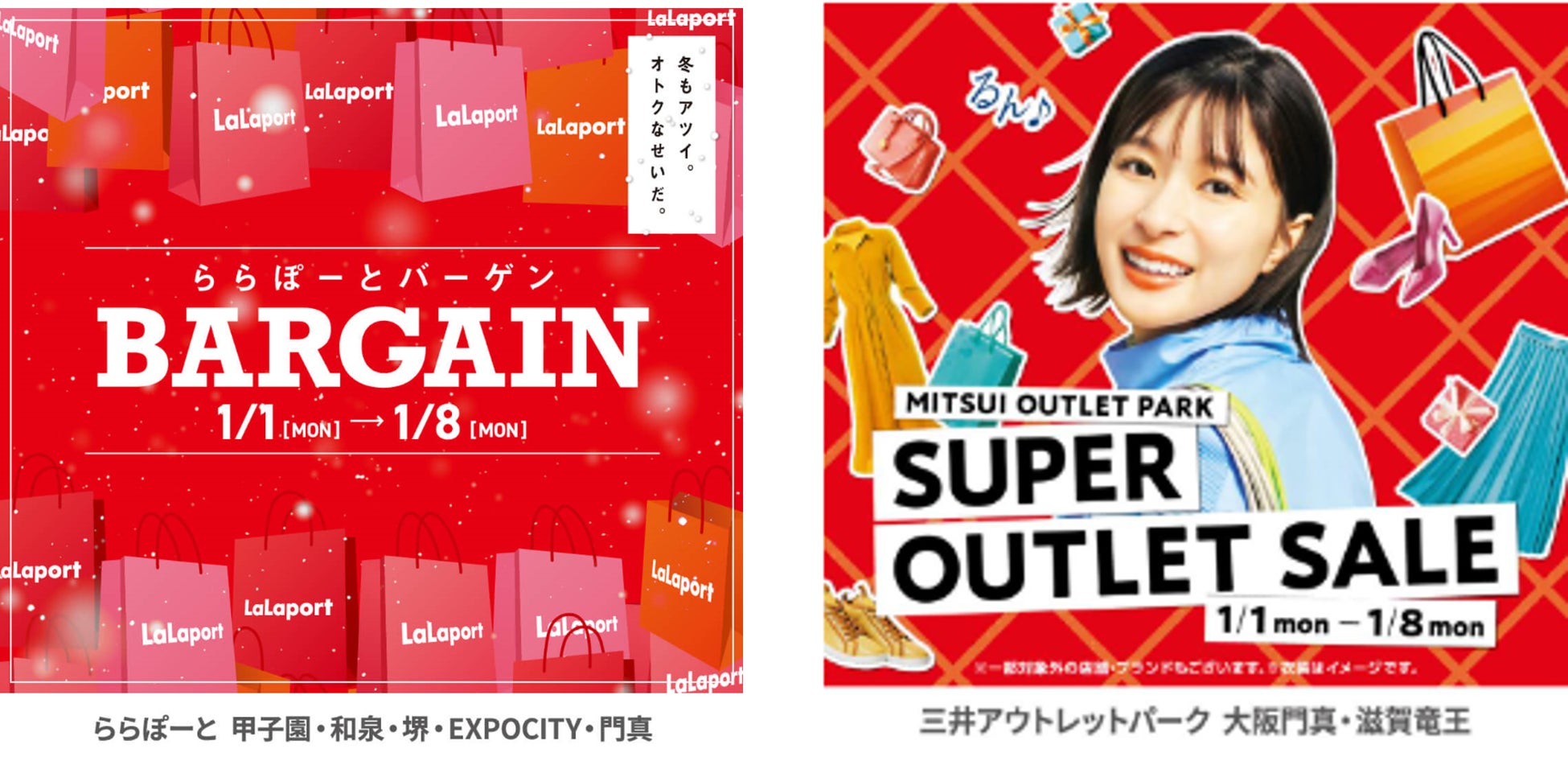 さらに、2024年1月1日(元日)~1月8日(月・祝)の期間、関西6施設の冬バーゲン『ららぽーとバーゲン』と 『MITSUI OUTLET PARK SUPER OUTLET SALE』を同時に開催いたします。