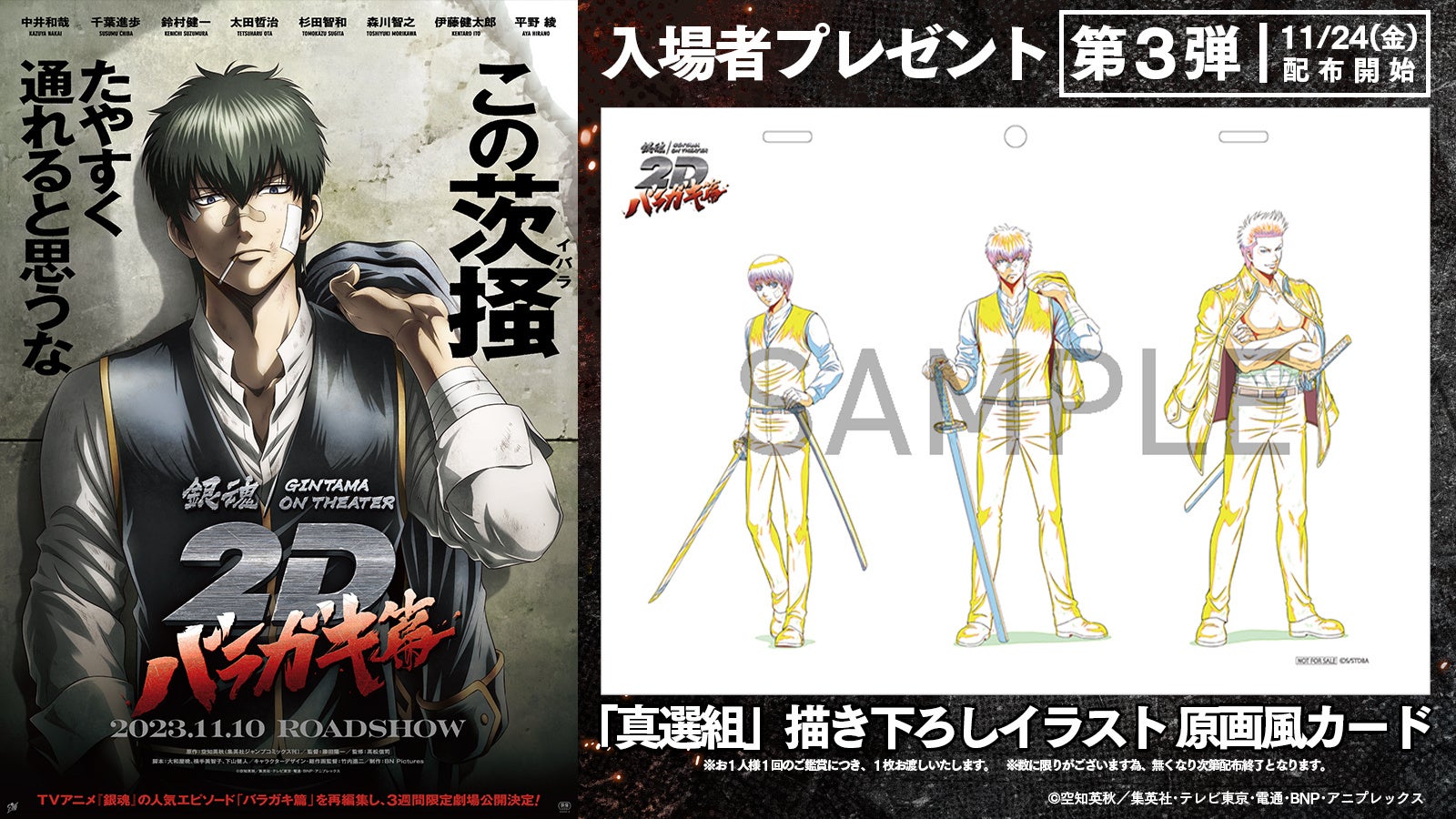 上映最終週となる11月24日(金)より配布される第3弾【「真選組」描き下ろしイラスト 原画風カード】は、本上映のために新規で描き下ろされた「真選組」土方十四郎・近藤勲・沖田総悟のビジュアルを、原画風にデザインしたA4サイズのカード。