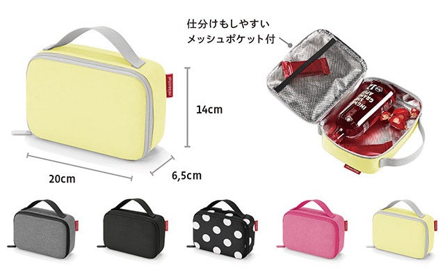 パタンと大きく開くファスナー式の開口部で中のものを出し入れしやすい保冷ケースです。内側には中身が見えるメッシュポケットがひとつついてて細々したものを入れるのに便利。暑さから守りたい小物類を入れてバッグインバッグとしての使用もオススメです。