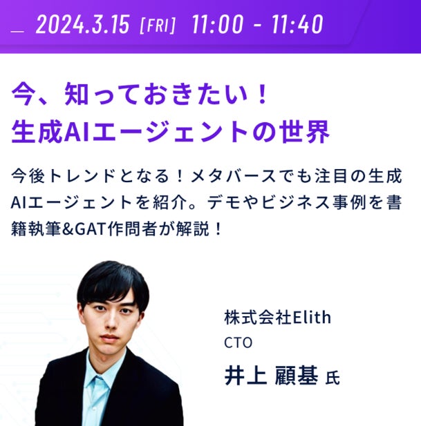 今後トレンドとなるメタバースでも注目の生成AIエージェント(デジタルヒューマン)の研究事例・ビジネス活用を紹介します。また、Elithでの生成AIエージェント技術を用いた企業との連携についても初公開いたします!