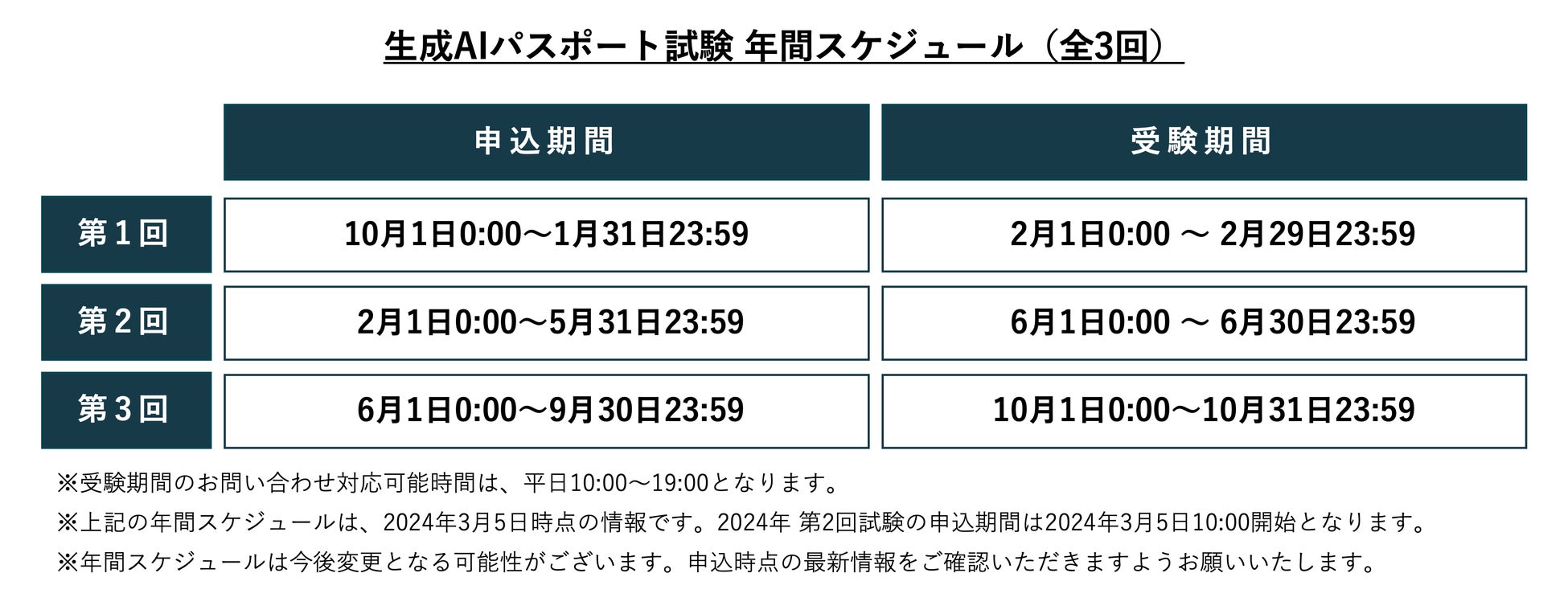 生成AIパスポート試験は、年3回(2月/6月/10月)のスケジュールで開催いたします。受験期間は各回1ヵ月間を予定しており、申込期間に応じて受験期間を定めています。今後は、通年で受験申込を受け付けておりますので、ご希望の受験期間に合わせてお申し込みいただきますようお願いいたします。