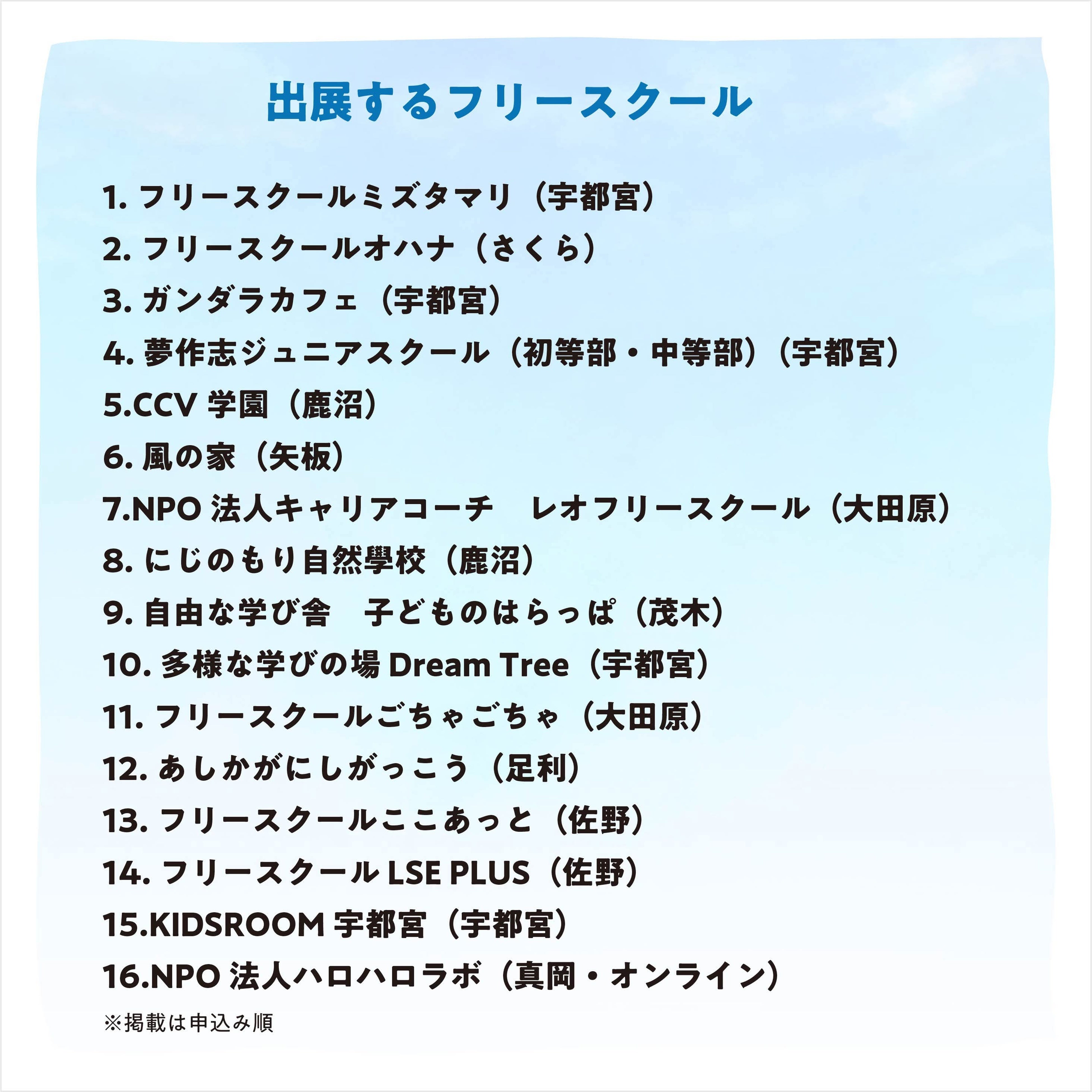 出展フリースクール(全16団体・7月20日時点/50音順)