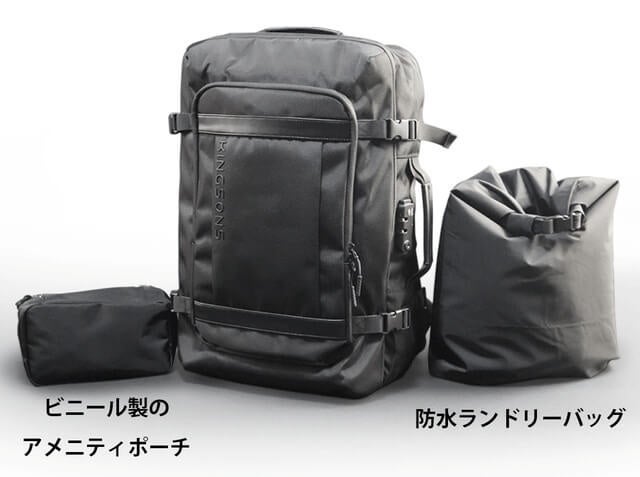 このバックパックには、ビニール製のアメニティポーチと防水のランドリーバッグが付属しています。