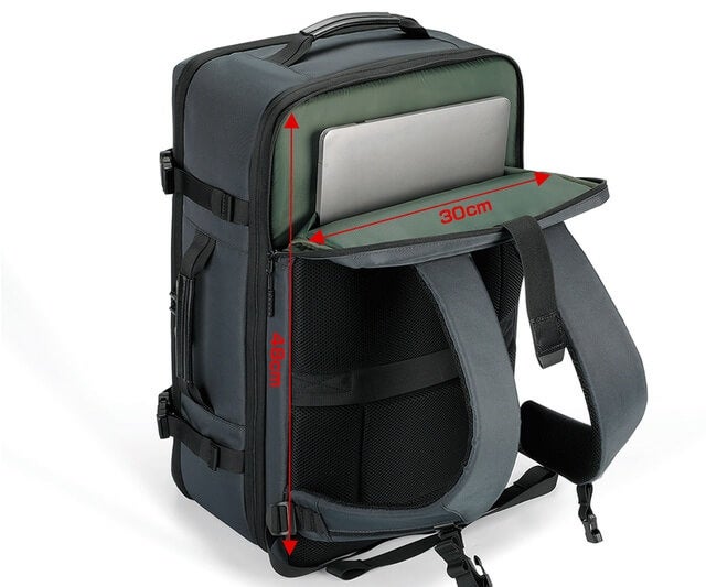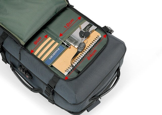 独立したPCスリーブと汚れた衣服を分けるランドリーバックが備えつけられていて、サイドにはスマホに接続できる充電ポートがあり、前面と背面には専用のジッパーポケット、更には旅行時に頼もしいダイヤルロック式のセーフティポケットもあります。