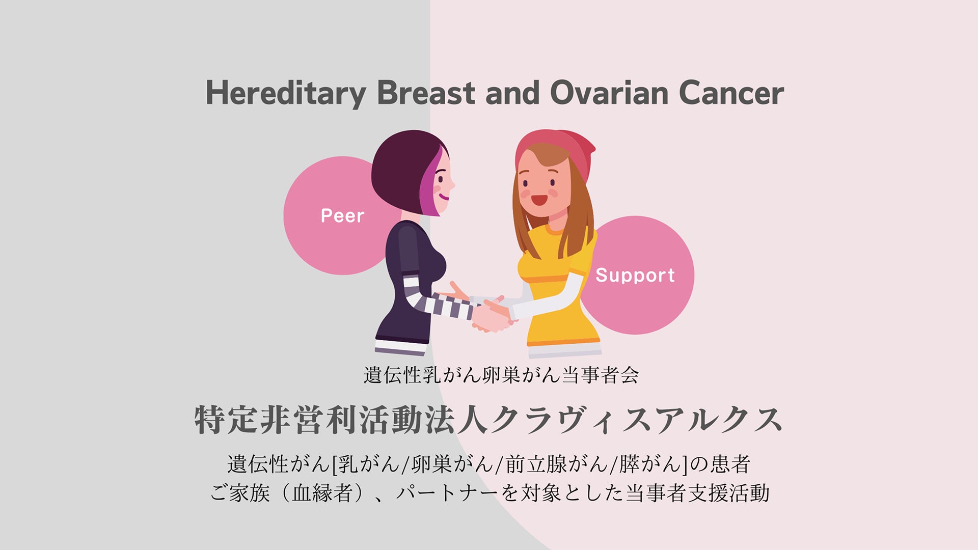 2014年より遺伝性乳がん卵巣がん(HBOC)当事者相互支援や、遺伝教育正しい理解の普及に努め、研究事業も積極的に実施。2018年からは当事者の思いを伝える「遺伝性がん当事者からの手紙」写真パネル展を実施しています。