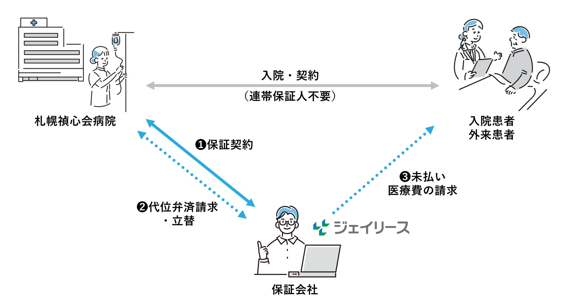 ジェイリースと札幌禎心会病院との医業未収金(入院費等)における保証契約締結により、患者さまは連帯保証人不要で医療サービスを受けられるようになり、札幌禎心会病院は医療費の未収金増加リスクの軽減、財務改善、合理化(実質的な未収金の早期回収、回収・管理業務等の負担軽減、キャッシュフロー・利益の平準化による経営の安定化等)を図ることができます。
