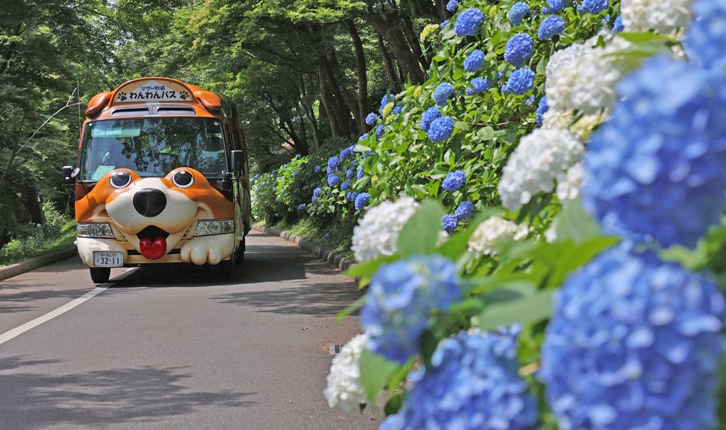 あじさいが最も群生しているメインエリアの「あじさい園」や、まきばエリアとあじさい園をつなぐ約500mにわたる「遊歩道沿い」であじさい鑑賞をお楽しみいただけます。さらに、遊歩道には場内周遊バスの「わんわんバス」が運行しているので、車窓からのあじさい鑑賞もおすすめです。