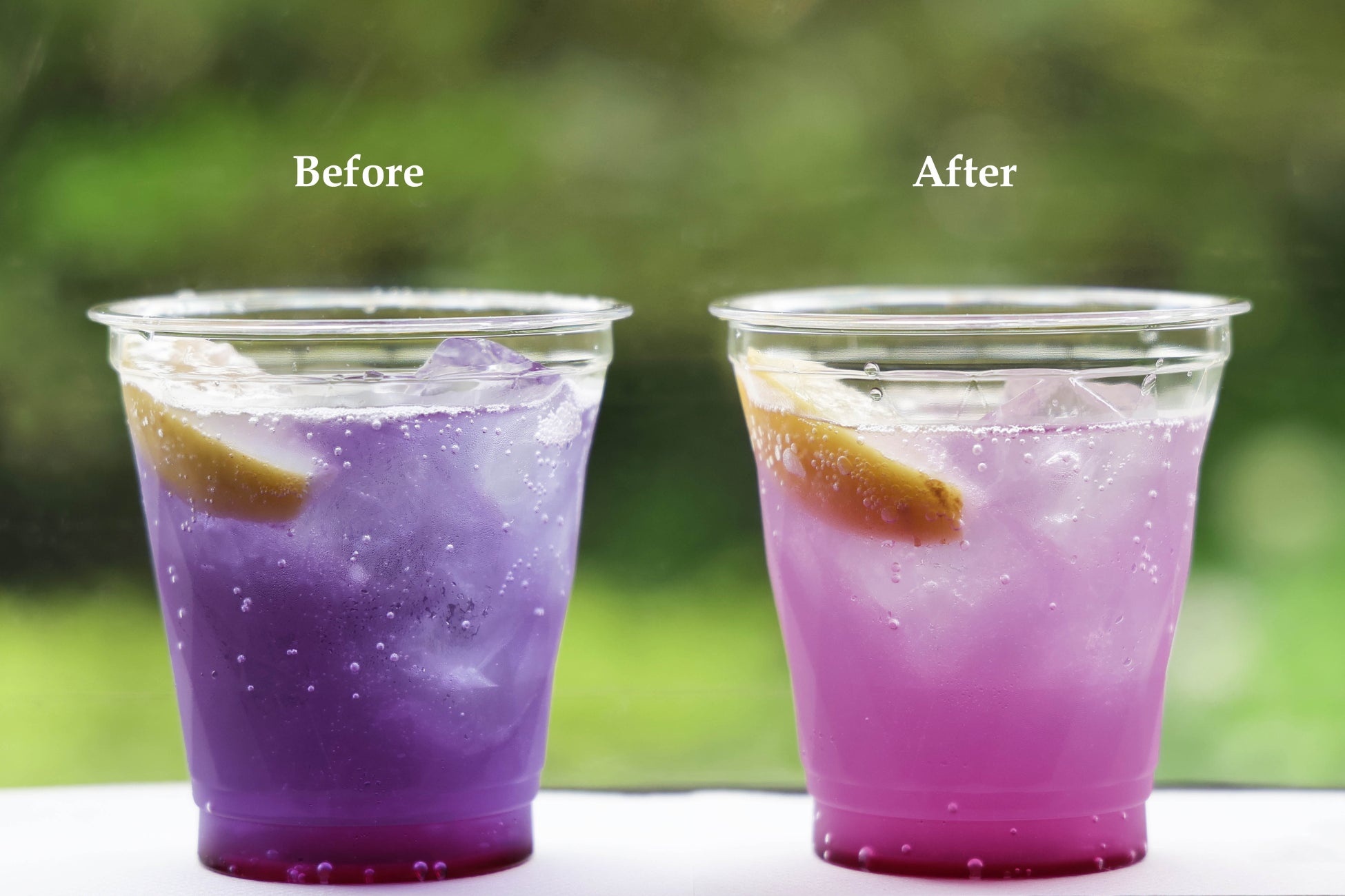 ご提供時は青紫色で、ご自身で別添えのレモネードベースを加えて混ぜると赤紫色へとカラーチェンジがお楽しみいただけます。