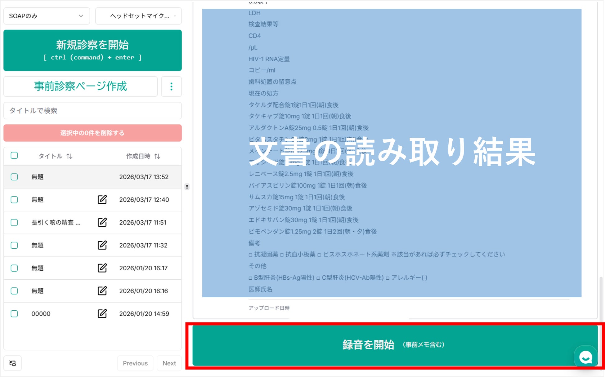 3. 診察(録音)開始:「録音を開始(事前メモを含む)」ボタンを押下し、通常の診察を開始してください。