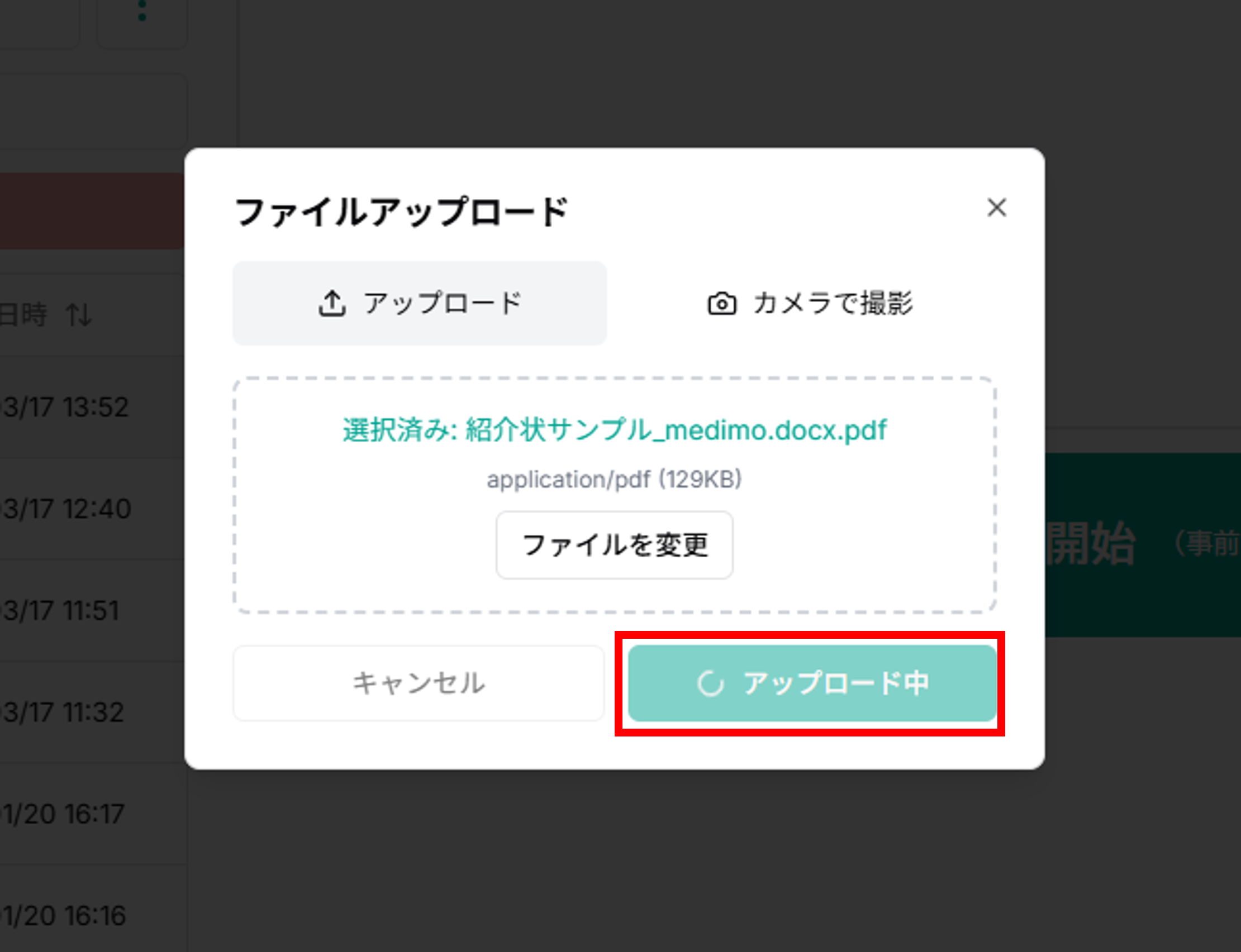 1.アップロード:診察ページの「診察メモ」の右隣にあるアップロードアイコンを押下し、OCRで読み取る文書ファイルを選択します。(※読み取り結果の出力まで少々お時間を頂戴します)
