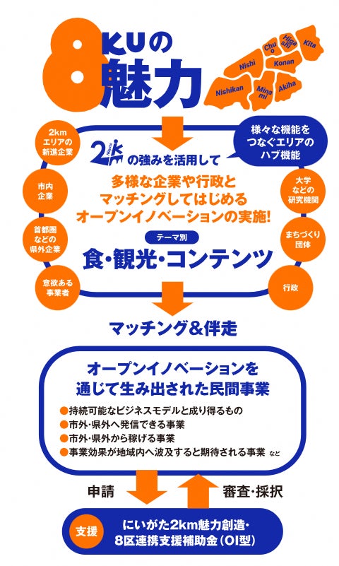 全国・世界からの新潟の主な玄関口であり、新潟の顔ともいえる”にいがた2km” 、山・川・海・温泉・果物・ものづくり、1つの市でありながら多様な色を見せる8区—。その掛け算が発する熱量が地域外のプレイヤーも動かす。幅広いナレッジ、ノウハウをもった組織同士の連携で、この地でしかできないイノベーションを目指して実施したプログラムです。