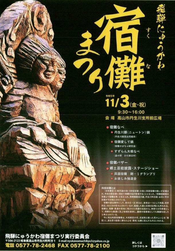 岐阜県高山市丹生川地域に伝わる「両面宿儺(りょうめんすくな)」を偲び、五穀豊穣を祈って、『飛騨にゅうかわ宿儺まつり』が開催されます!4年ぶりの開催となる今年は、名物の宿儺なべを3種類を用意し、さらに新企画の「両面宿儺剛-1(ごうわん)グランプリ」を開催。秋の味覚や各種イベントをお楽しみください。