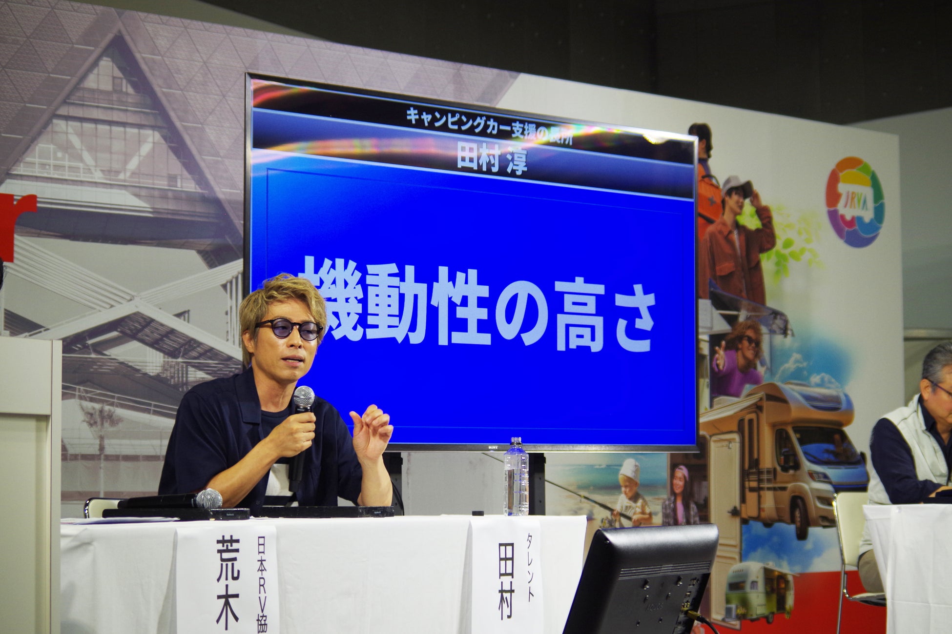 第2部のパネルディスカッションでは、キャンピングカーと防災の関わりについて多角的な議論が行われました。登壇したのは、タレントの田村淳さん、NPO法人全国災害ボランティア支援団体ネットワークの事務局長明城徹也さん、アウトドア防災ガイドのあんどうりすさん、日本RV協会会長の荒木賢治です。