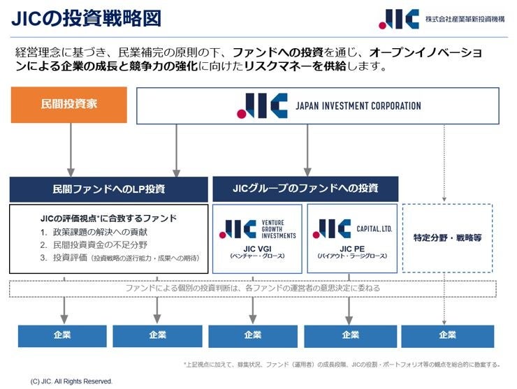 JIC は2018 年 9 月、産業競争力強化法に基づき発足した投資会社です。JICは、国内投資・イノベーションの好循環の創出、スタートアップの創出・育成、大学発スタートアップ・中堅企業等による地方に眠る経営資源の活用、市場・ビジネス環境の変化に対応する事業再編の促進、を重点投資分野としています。これらの分野に対し、傘下のファンドや民間ファンドへの LP 投資を通じてリスクマネーを供給することで、我が国におけるオープンイノベーションを推進し、我が国産業の競争力強化や投資エコシステムの拡大に貢献することを目指しています。