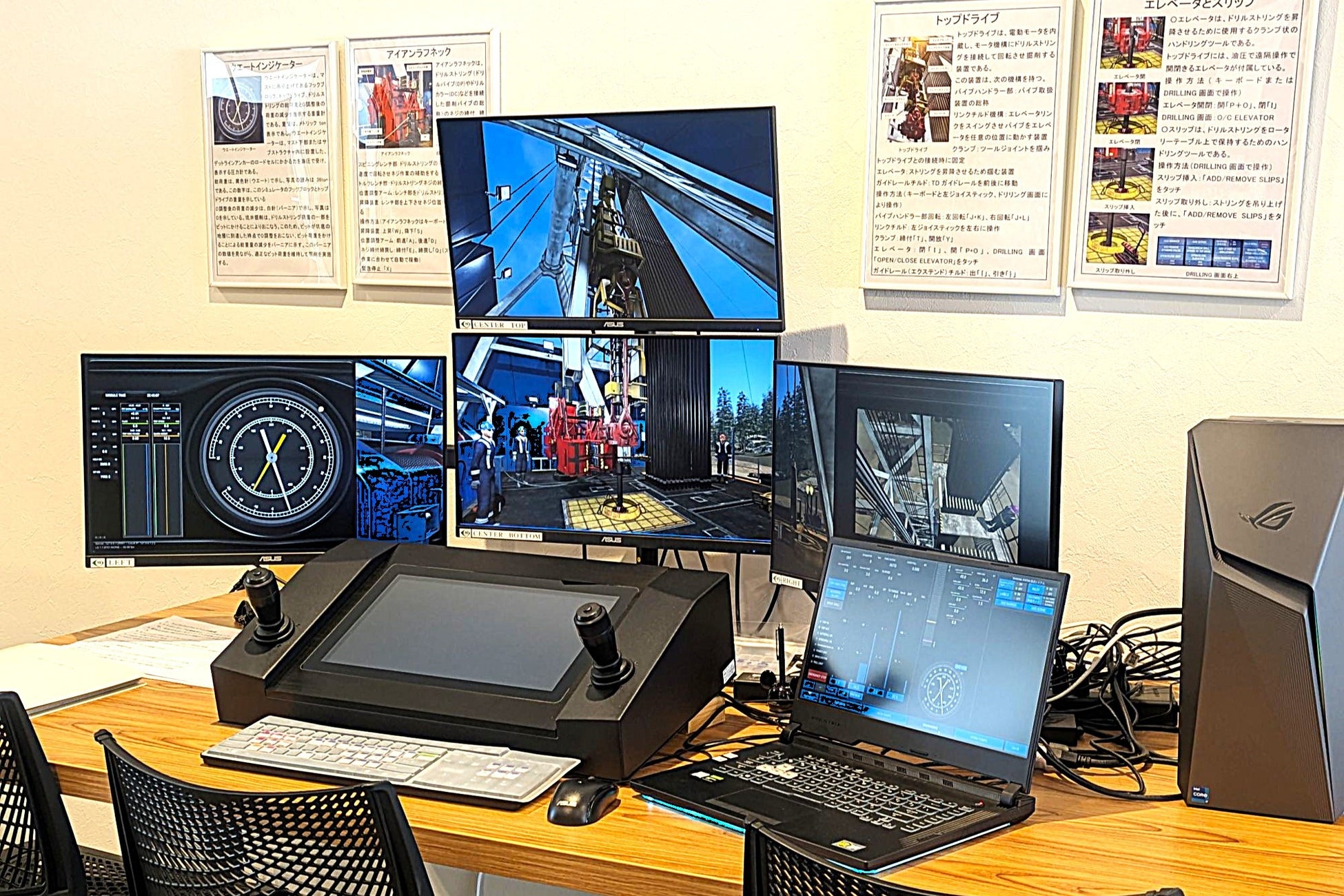 学校には寮と食堂を完備し、1年という限られた時間の中で存分に学べる環境を整えています。掘削に関わる各分野の経験豊かで優れた講師陣が、プロフェッショナルへの道をサポートします。座学の他に、国内で唯一の「掘削シミュレーター」を使ったトレーニングや実物の掘削機に触れながらの演習も行います。講師の先生も寮に宿泊するので夜遅くまで授業の質問を受けたり、就職の相談にのったりもしています。