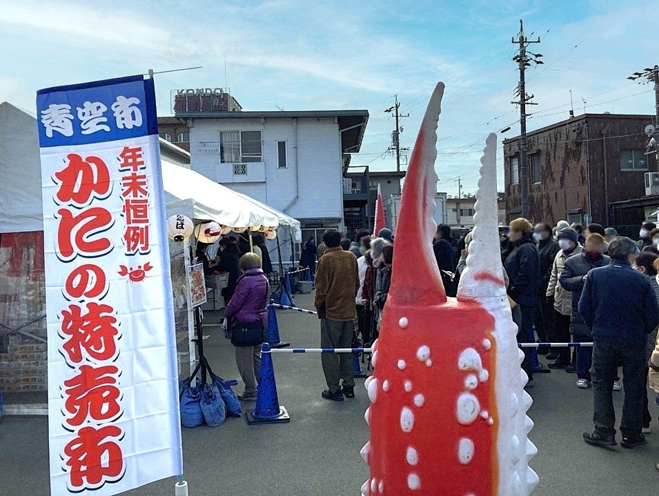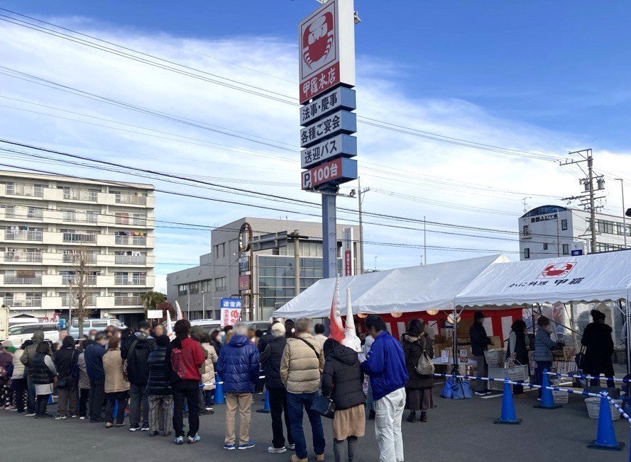 年末年始の食卓を彩る、旨みの詰まった甲羅本店の蟹を求めて、毎年多くのお客様が行列をつくる様子は各地域で風物詩となっています。今年も寒さが厳しい中での開催が予想されますが、活気あふれる「蟹の青空市」にぜひお越しください。