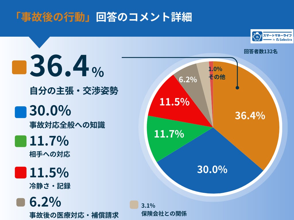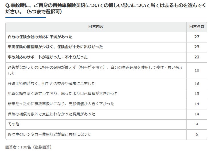 「解決を急ぎすぎた」「妥協するべきではなかった」など、事故直後の判断に関する後悔が多数。保険会社に任せる部分と、自ら主張すべき部分のバランスが重要といえます。