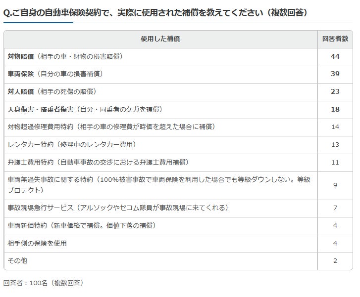 そこでスマートマネーライフ編集部では「今後に生かしたい教訓」として自動車保険について言及した100名に対し、補償内容や保険会社の選び方についてさらに詳しく調査を行いました。