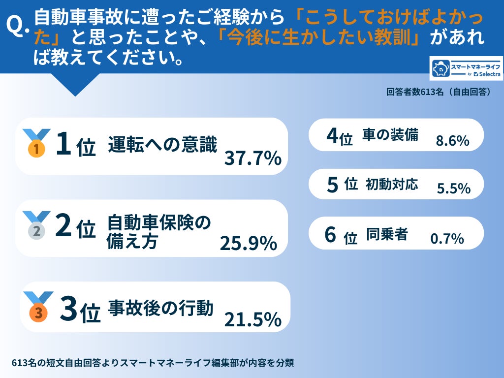 自動車事故を経験した回答者から寄せられた「こうしておけばよかった」のリアルな声をスマートマネーライフ編集部が分析。6つのカテゴリにまとめました。ランキング形式で紹介します。