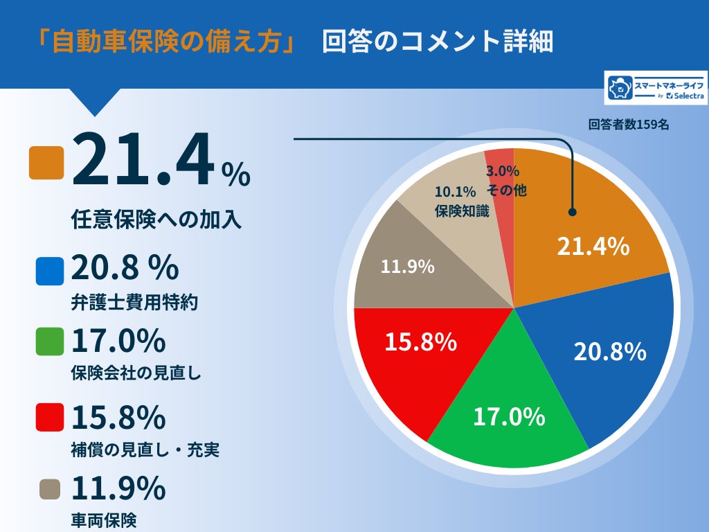 「任意保険には必ず入るべき」「弁護士費用特約をつけておけばよかった」「補償内容をもっと手厚くすべきだった」といった声が多く、自動車保険の補償内容をよく理解して契約することの大切さが浮き彫りになりました。